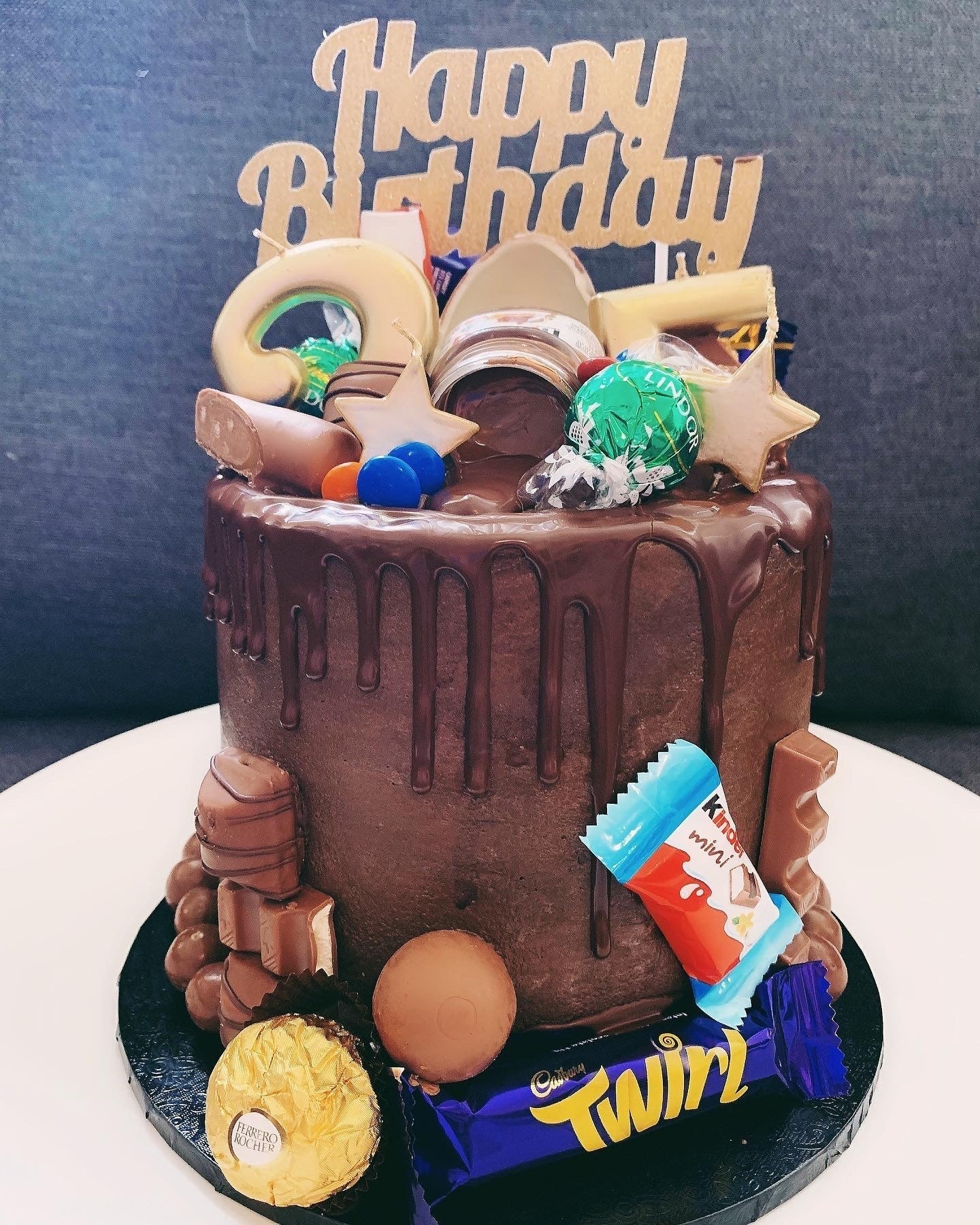 Immerse yourself in the ultimate chocolate experience with our Chocoholic Overload cake. This decadent delight features a luscious chocolate drip cake adorned with a medley of everyone's favorite chocolates, topped with a festive "Happy Birthday" topper and candles.